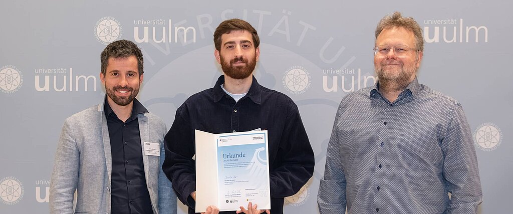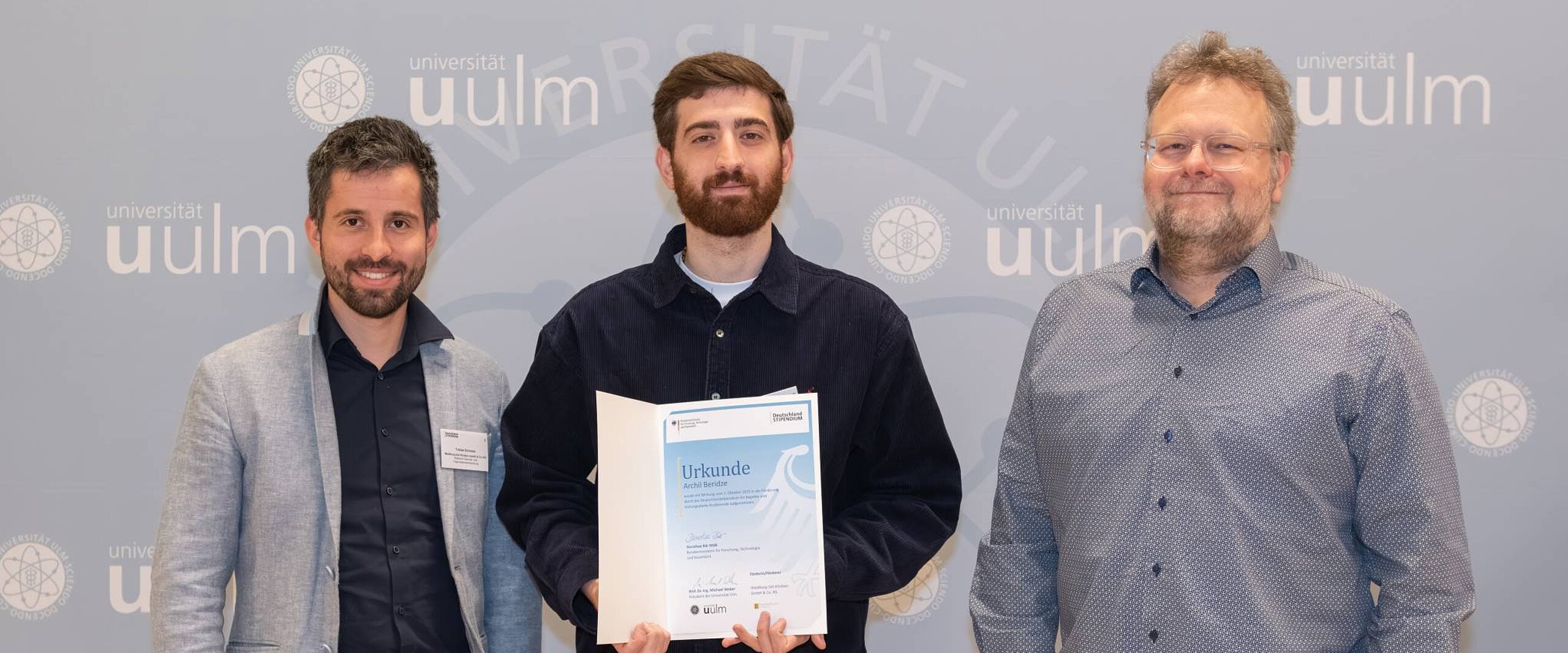 Um den neuen Stipendiaten Achil Beridze persönlich zu begrüßen, waren Tobias Schmied (Personalentwicklung) sowie der Chefarzt der Rehabilitationsklinik Bad Wurzach Dr. Marc Riemer, bei der Vergabefeier in Ulm. Der angehende Mediziner stammt aus Georgien und hat dort bereits acht Semester Humanmedizin studiert. Sein Studium setzt er nun in Deutschland an der Universität Ulm fort. Im Austausch mit dem Klinikverbund betonte er, dass er in Deutschland sein medizinisches Wissen vertiefen und wertvolle praktische Erfahrungen sammeln möchte.